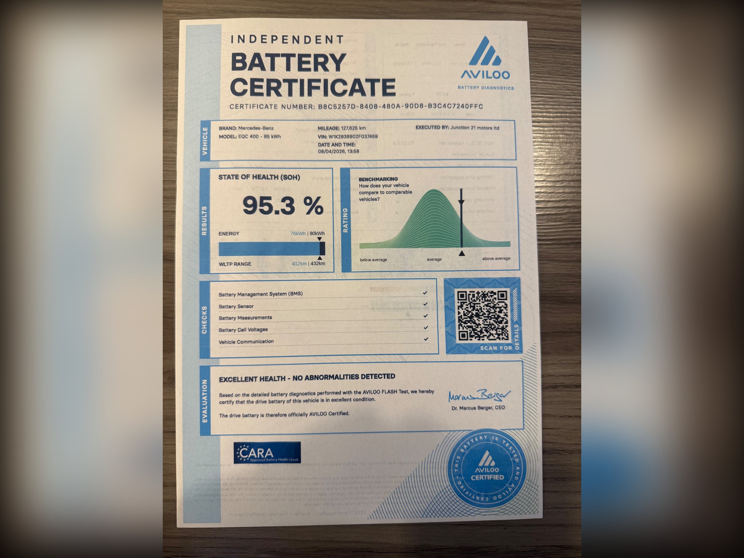 Main Battery was tested with Aviloo and comes back with 95.3% - Excellent Health